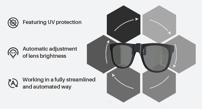 例えば、ドライブ中暗いトンネルを走行している時にはレンズは薄く、トンネルを抜けた明るい場所ではレンズの色が自動的に濃く変化します。