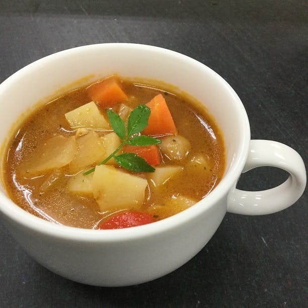 オリーブオイルでにんにくとベーコン、玉ねぎ、にんじん、セロリ、赤ピーマン、ヒヨコ豆、キャベツを炒め、その後トマトソース、じゃがいも、グリンピースを入れて煮込みました 。9種の野菜が入ったトマトベースの具だくさんミネストローネです。コトコト煮込んで野菜の甘みがしみ込んだ本格的で味わい深いホテルクオリティのスープです。
