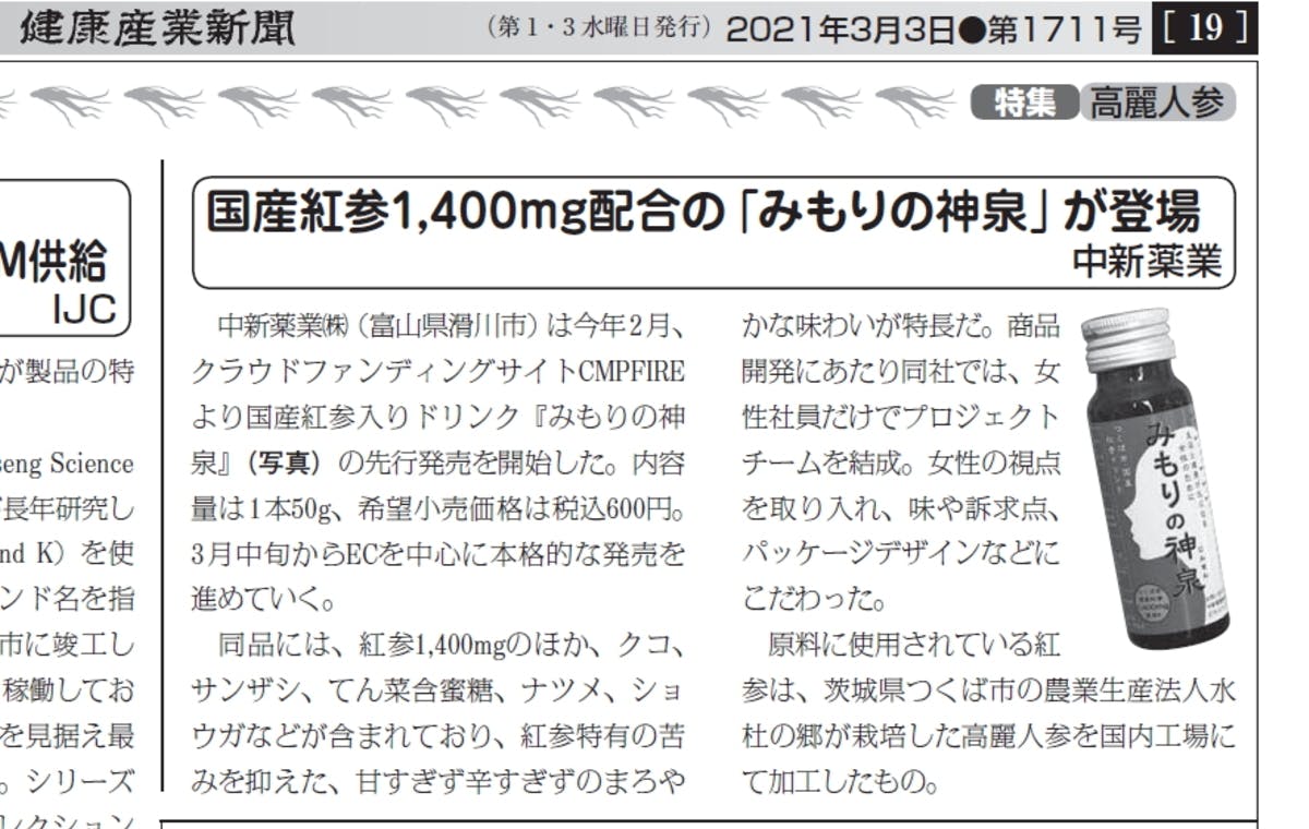わたしたちの「みもりの神泉」が健康産業新聞に取り上げられました。