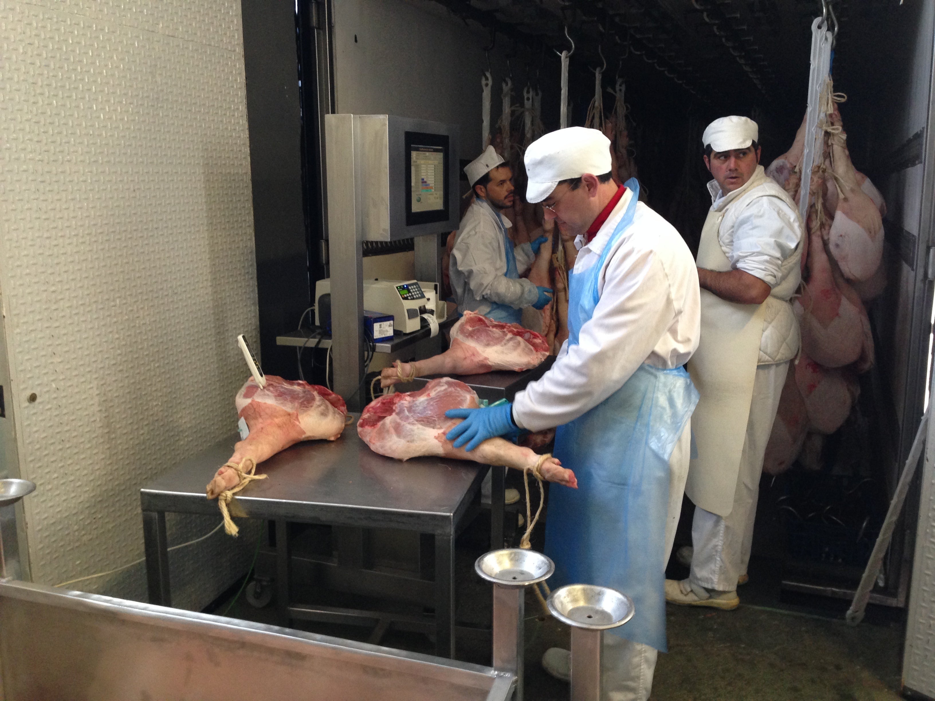 生ハムの原料となる豚モモ肉は1本1本検品して、我々の要望するレベルのものだけを選別します。大きさ、肉色、締まり具合等、多岐にわたり厳しくチェックしていきます。