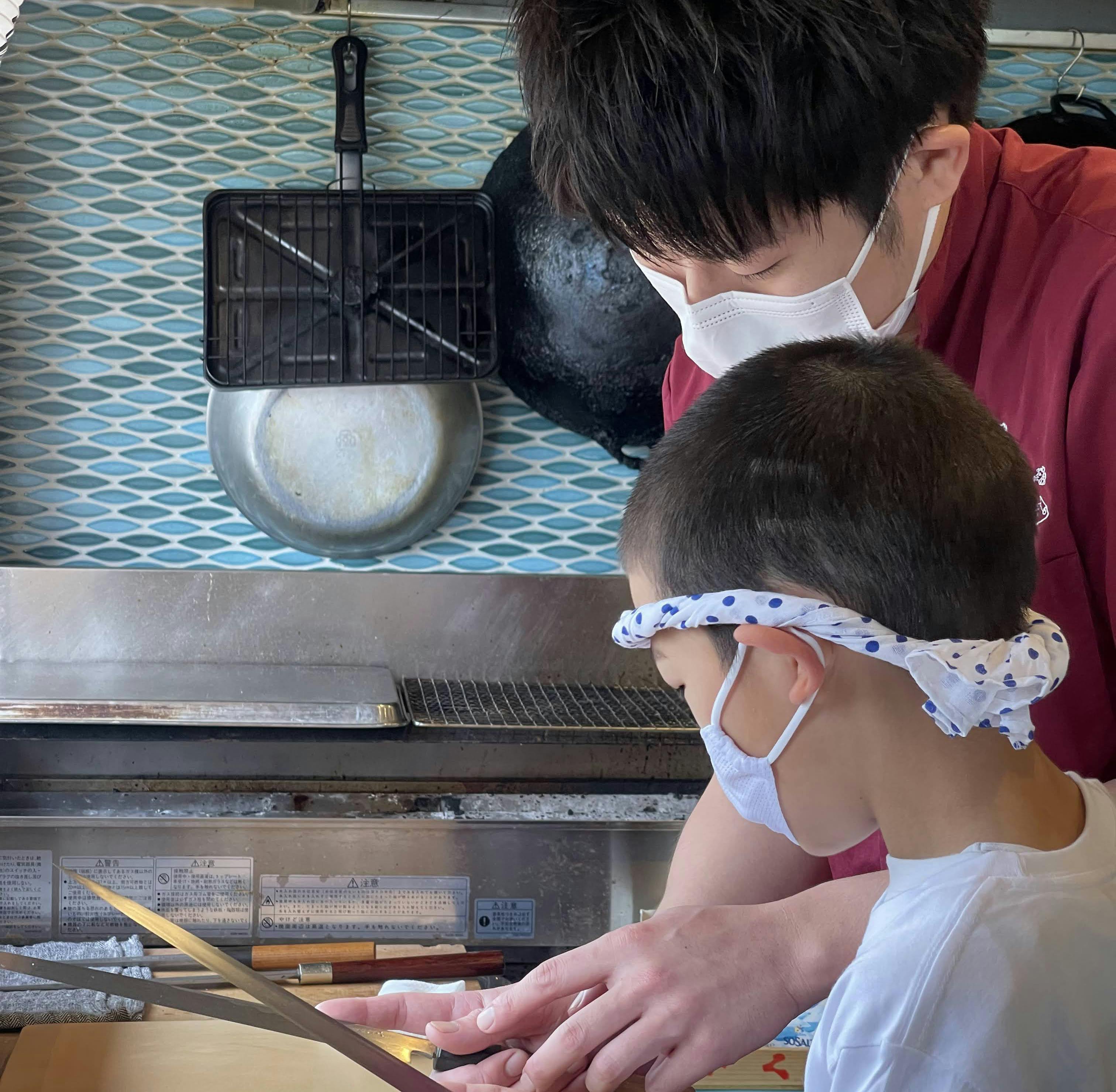 2021/10/20 16:08「どこでも魚進!キッチンカーで魚進の自慢の魚をお届けします!」をご支援いただきありごとうございます。プロジェクトは無事成功をおさめ、ご支援をいただいた皆さんへのリターンが始まっています。10月中旬、「1日板長さん体験(お子様限定)」を開催しました。今回は、お姉さんと弟さんのお2人でご支援いただいていたので、同じ日にご参加いただきました。魚進オリジナルTシャツに着替え、ねじり鉢巻をし、手を洗って始まりました。魚進のスタッフの挨拶と板長さんのお仕事の説明をきいて、いざ板長仕事です!お客様役はお母さんにお願いして、好みの刺身を選んでもらい切り付けしました。慣れない長い刺身包丁を使って、刺身を切り、盛り付けまで板長さんのお仕事です。好きな魚の話や旬の魚のこと、魚の豆知識も伝えながら、楽しく体験会ができました。お姉さんは、サバサンドを作りました。サバサンド作り方を聞きます。サバサンド用のNOOK BREAD SHOP オリジナルのトマト&ペッパーのパンと脂のりがよいノルウェー産のサバを香ばしく焼き上げます。モクモクと出るサバの煙にも負けずこのスマイル!最後に、出来上がった商品を持ち記念写真撮影。弟君作「お母さんが選んだネタの刺し盛り」お姉さん作「サバサンド」とサツマイモもオレンジ煮ご参加いただきありがとうございました! もっと見るありがとうございました