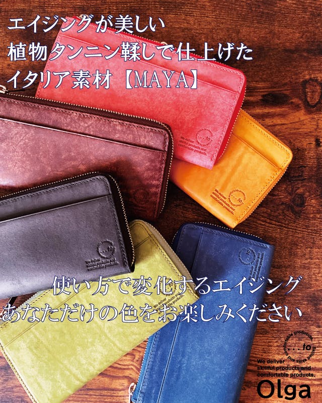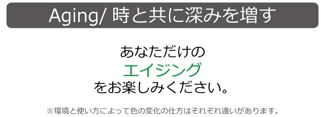 使用しているIL PONTEの『MAYA(マヤ)』は、吟擦り加工(表面を擦る加工)が施されており、吸い付くような肌触りが特長的です。エイジング(経年変化)が早いため、味わい深い色へと変化して行きます。使い方によってエイジングの仕方も様々です。あなただけのエイジングをお楽しみください。