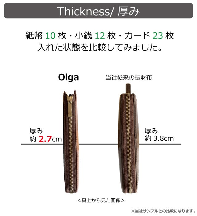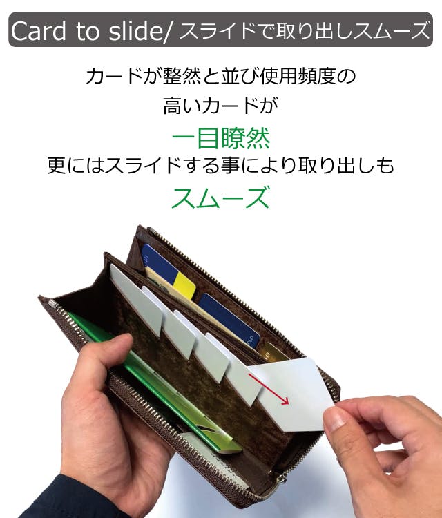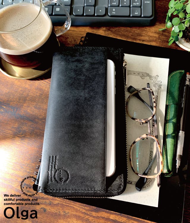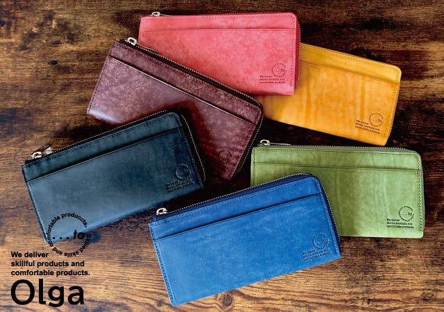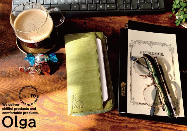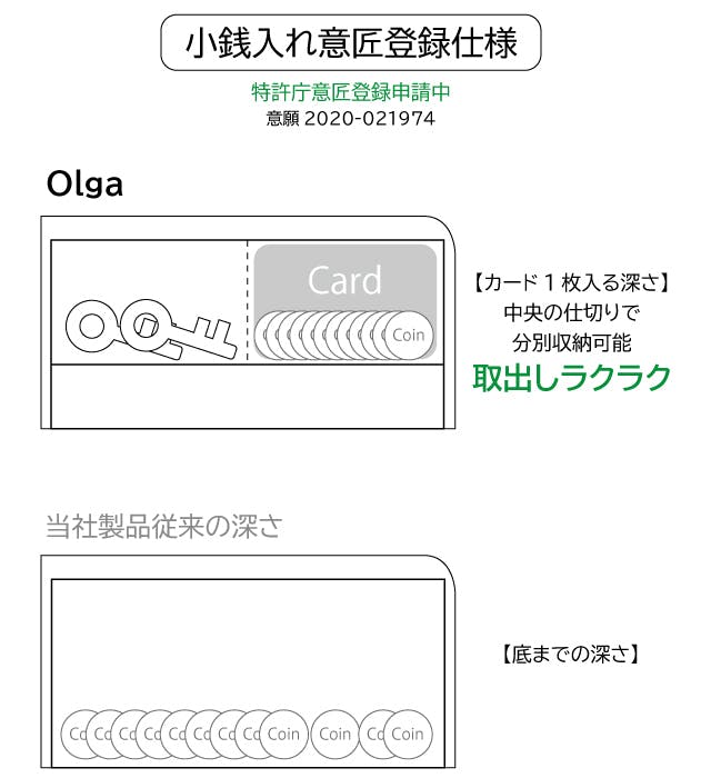 キャッシュレス時代と言われる昨今ですが、まだまだ病院などでは、現金での支払いが多いのが現状です。しかし、カードを携帯する事は現金を携帯する事と同等に必須になってきています。T.P.O.に合わせて財布を着替える為には、普段使い並びにベース基地にもなり、全てを収納出来る【長財布】が必須となるのではないでしょうか?長財布に綺麗且つ、整然と収納出来たらとても便利ですよね?この想いから、商品開発をはじめ、『...to・Olga(オルガ)』が完成しました。Olgaは、使用頻度の高いカード5枚が一目瞭然で見分けられ、斜めにスライドする事により出し入れがスムーズに出来る仕様と、小銭入れの深さを取り出しやすい深さにした仕様(特許庁意匠登録出願中)を兼ね備えた【究極の長財布】です。