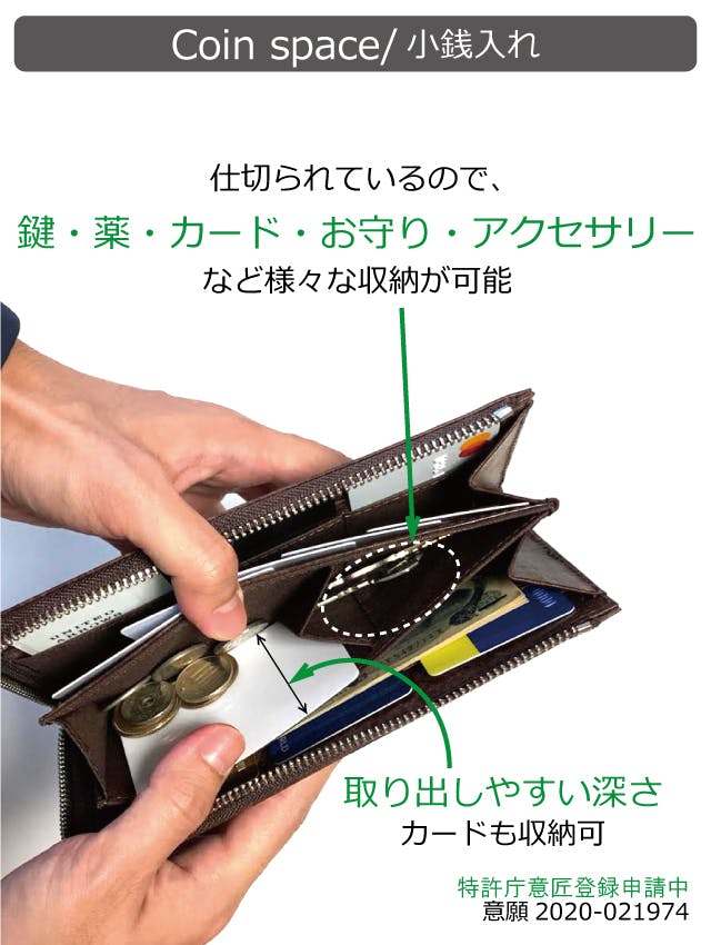 支援を考えていますが、質問があります。 この構造で小銭は飛び出しませんか? 外周のファスナーを閉めることで、スペースを消して中で飛び出すことはないでしょうか? ファスナーを開けたら中で小銭があちこちにあるという状況は嫌です。