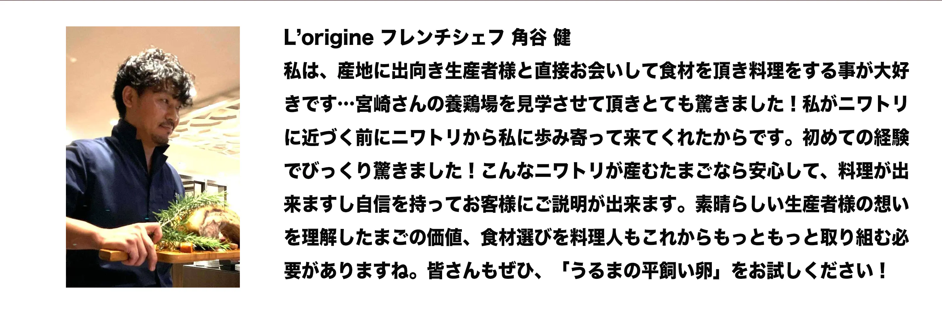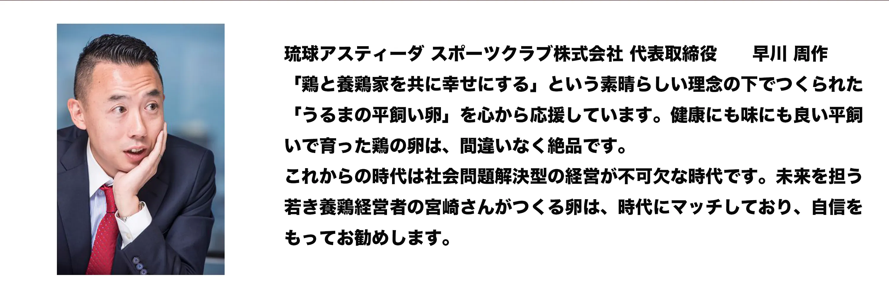 「うるまの平飼い卵」を生産するEggSmart株式会社の宮崎です。