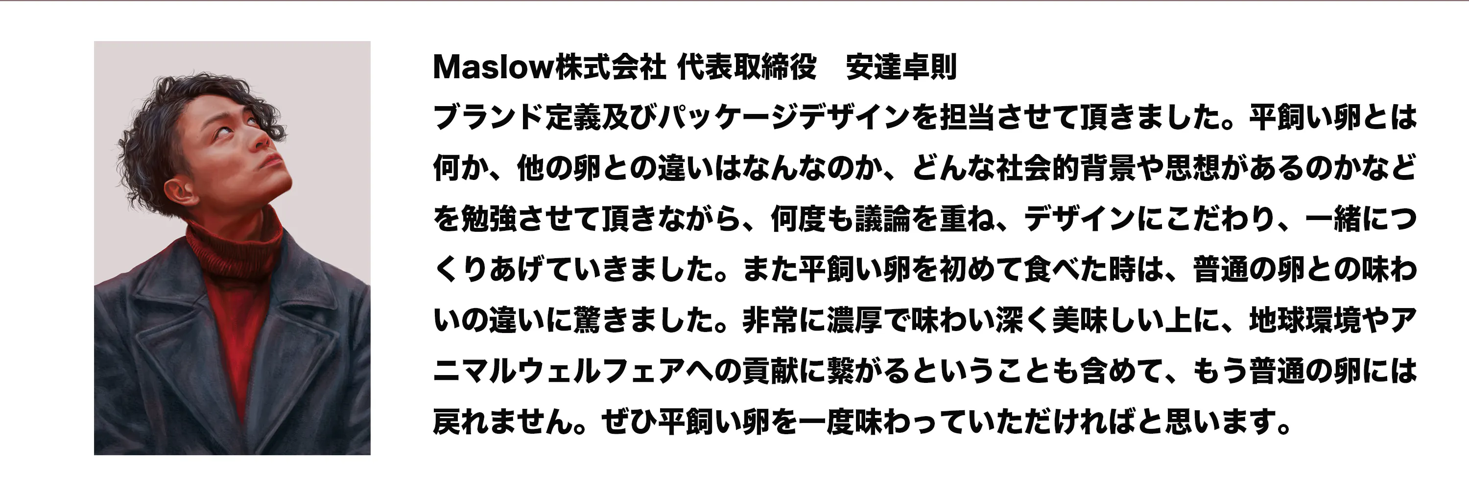 ですので、私は日本における平飼い卵の比率を欧州のそれに近づけることを使命としています。そのために、業界の先頭に立つ「平飼いのリーディングカンパニー」のポジションを私たちは目指しているのです。