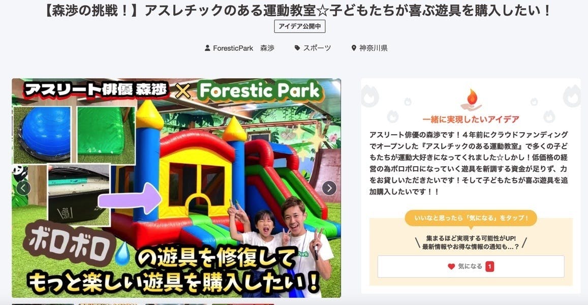 2025/11/19 13:05クラウドファンディングご支援いただきました皆様へこんにちは、ForesticParkの森渉です。2021年オープンの際のご支援をありがとうございました。改めまして、御礼申し上げます。皆様のご支援のおかげで、オープンできたパークも5年目を迎え、オープン当初は約60名だった生徒も約110名に増え、毎日、多くのお子さんが楽しく運動教室に通ってくれています。今回のご報告は、この度2回目のクラウドファングにチャレンジすることを決定いたしましたので、お知らせいたします!!オープン当初から、5年使い続けた道具や器具を修理、補修を繰り替えし使ってきましたが、それももう限界に達する物も多く、より安全な教室を実施するためにも、今回のチャレンジをして、目標まで届いたら子どもたちが絶対に喜ぶ新しい遊具、道具の購入を目指しています。前回、多くの皆様にご協力いただきましたが、再度、子供たちのさらに明るい未来のためにお力をお貸しいただけましたら幸いです。開始日は12月1日(月)17:00~予定です。現在、以下のページにて予告をご覧いただけます。ページ公開までに、『お気に入り登録』を行っていただきますとスムーズなご支援がいただけると思います。※公開前に登録が100名を超えているとトップページに載りやすくなり、資金が集まる可能性が上がります!【クラファンページURL】 https://camp-fire.jp/projects/898626/idea【QRコード】皆様のご支援、お待ちしております!!! もっと見る