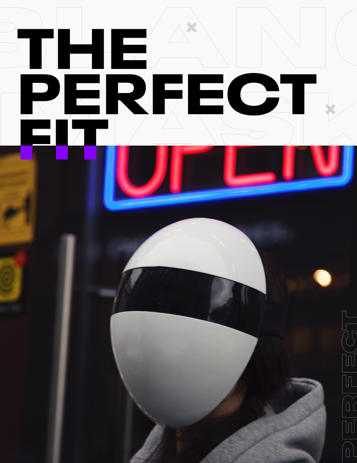 私達はあなたのプライバシーと個性に重点を置いてブランクをデザインしました。顔の真ん中でふたつに分れ、左右は磁石で合体されています。手のひらでパカっと二つのパーツを顔に被せ、合わせるだけ。ちょうど顔の中央で組み合わさります。