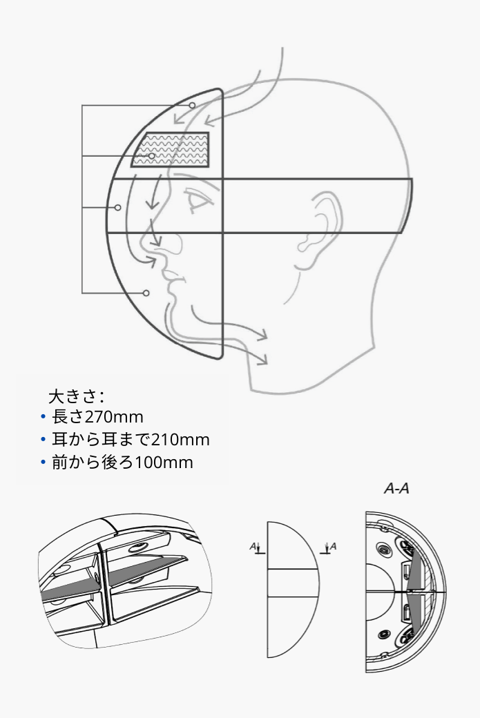 サイズ:ほぼ調節の必要がない95%の顔・頭にフィットするフリーサイズを使用しております。