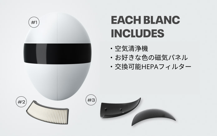 ブランクはいつでも綺麗な空気が吸える高品質なアクセサリーです。ブランク一つにつきHEPAフィルターパックが2つ付属しており、最大14日間(平均)空気を浄化します。