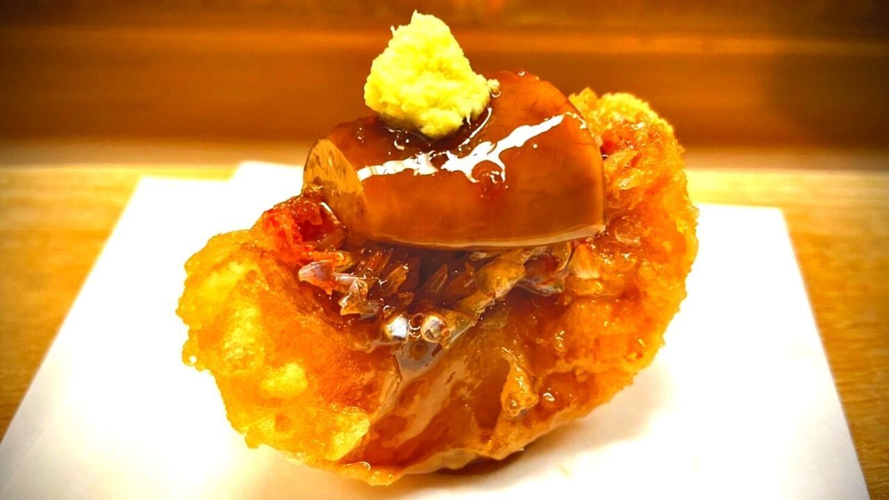 上には甘辛く炊いた"キンキの肝"を乗せて。