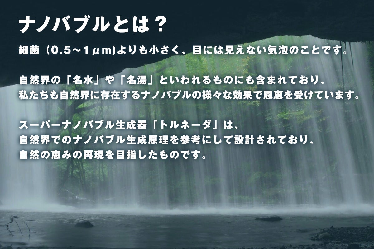 私自身、ナノバブル生成器「トルネーダ®」を使い始めたところ、様々な驚きの効果を実感、その技術に感銘いたしました。「水」だけで、汚れの洗浄ができる。