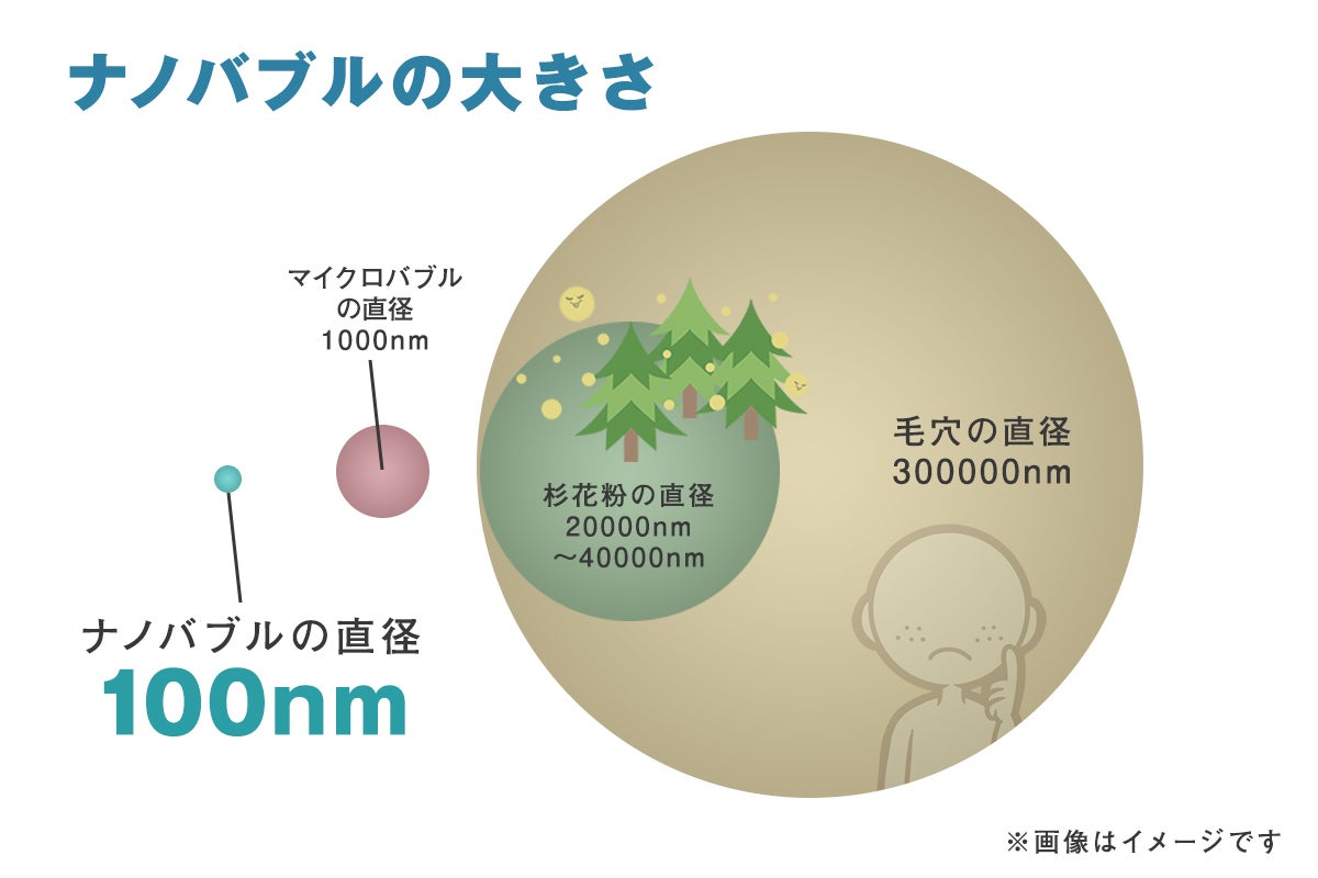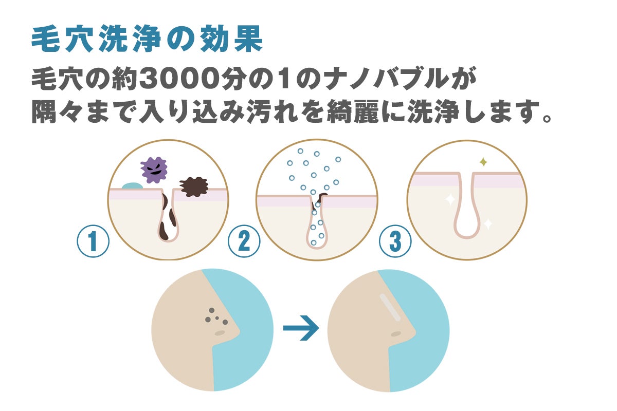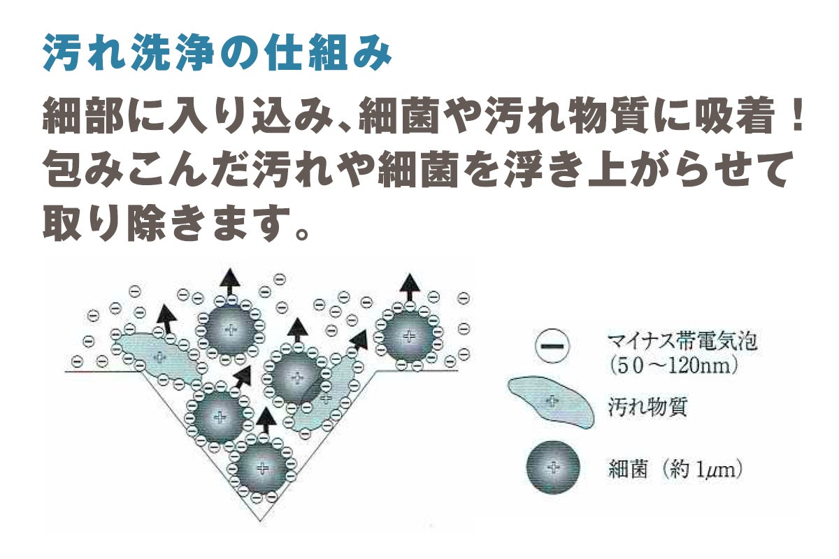 ①特許取得済みのナノバブル生成技術により通常の水よりはるかに優れた洗浄能力が期待できます