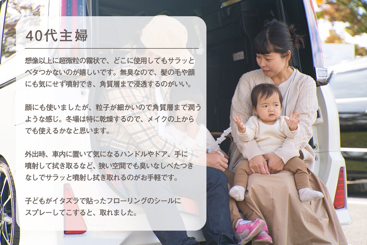 「お手軽」「コンパクト」「経済的」で、「化粧水を入れて美容効果」をはじめ工夫次第で、いろいろな用途が考えられます。こんな技術を待っていた!今まさに子育て中の母として「子供のために清潔な環境を保つことができる商品を、より多くのママたちに届けたい!」という思いから、今回のクラウドファンディングに踏み切りました。