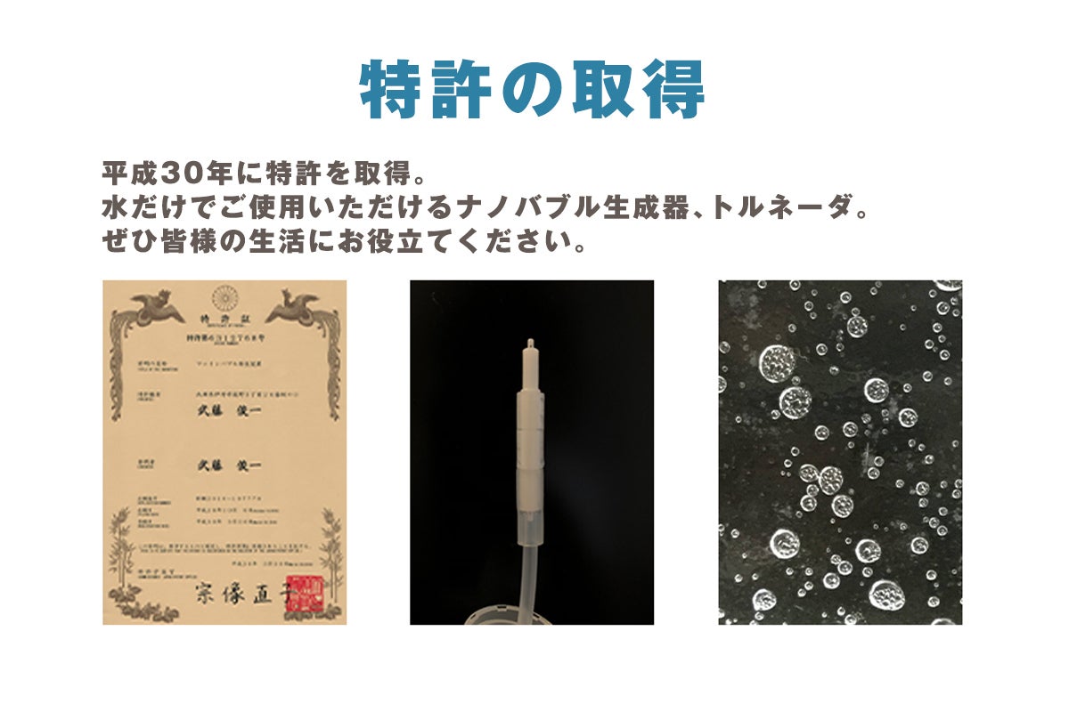 私の父は、10年にわたり、ナノバブル生成器「トルネーダ®」(PAT.№第6312768号)の開発を支援してまいりました。ナノバブル生成器「トルネーダ®」の開発者、武藤俊一先生が、長年の研究開発を経て、ついに平成30年3月特許を取得されました。