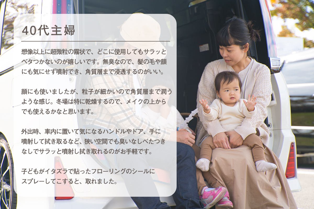 「お手軽」「コンパクト」「経済的」で、「化粧水を入れて美容効果」をはじめ工夫次第で、いろいろな用途が考えられます。こんな技術を待っていた!今まさに子育て中の母として「子供のために清潔な環境を保つことができる商品を、より多くのママたちに届けたい!」という思いから、今回のクラウドファンディングに踏み切りました。