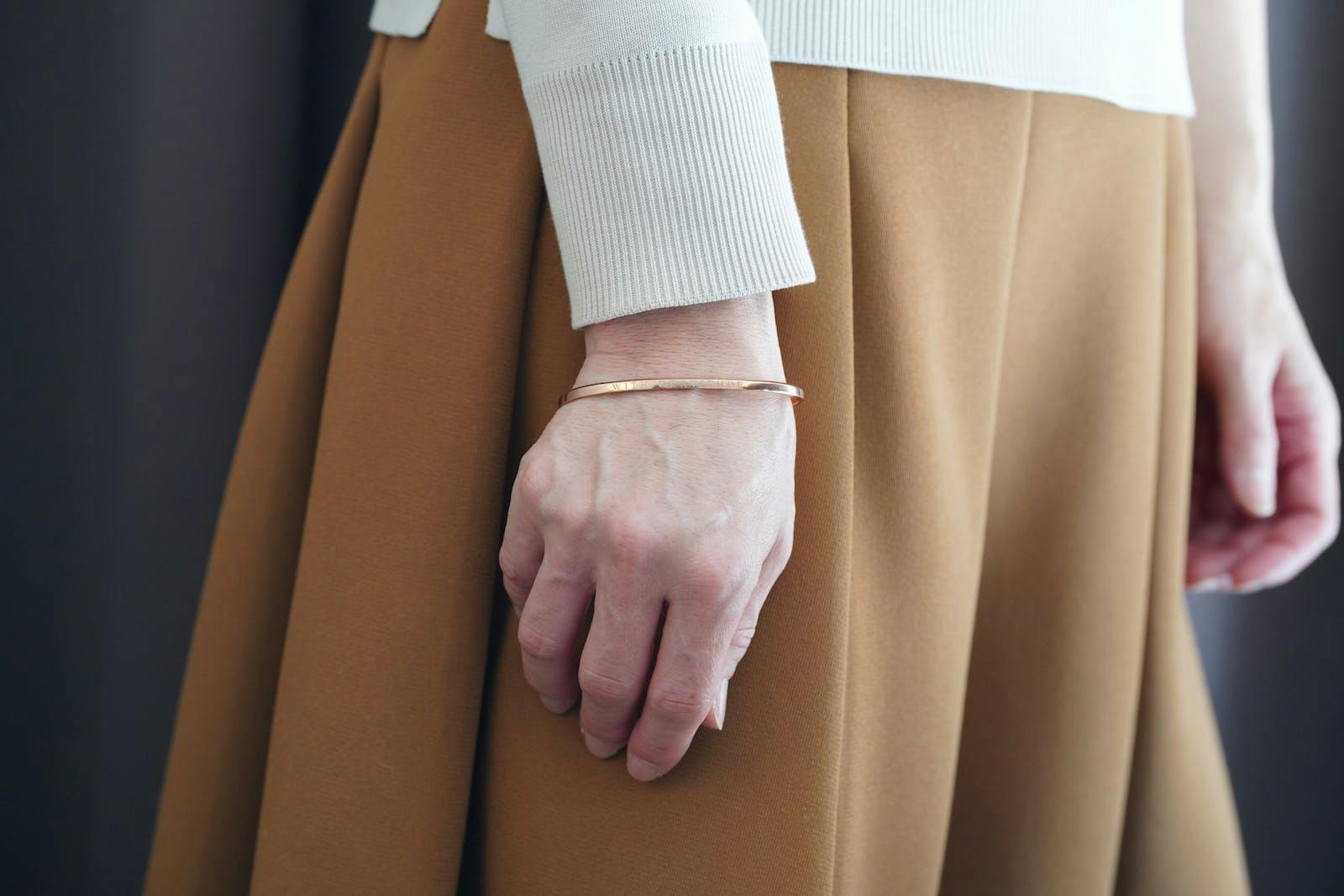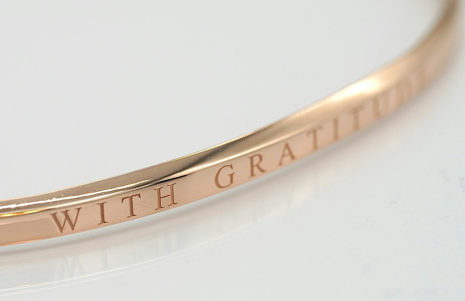 バングルの表面には「WITH GRATITUDE」の文字が入り、フォント自体も美しいデザインになるように選び、文字の間隔にもこだわっています。
