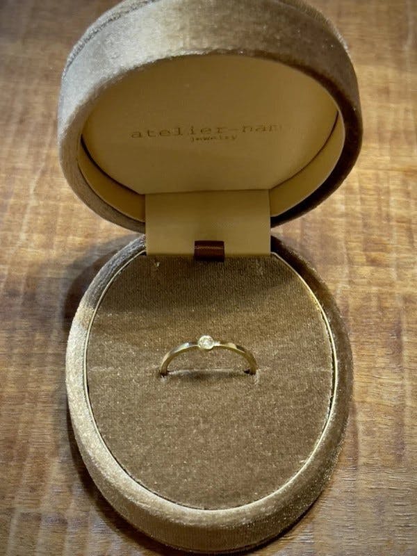 atelier-namiではこのきらびやかなダイヤモンドを一段ときれいに魅せるために、細身の18金のリングに覆輪留めというダイヤモンドの留め方を選択しました。リングの中に輝くレモンイエローのダイヤモンドは、きっと毎日着けたくなるくらいきれいだなと思ってもらえるはずです。