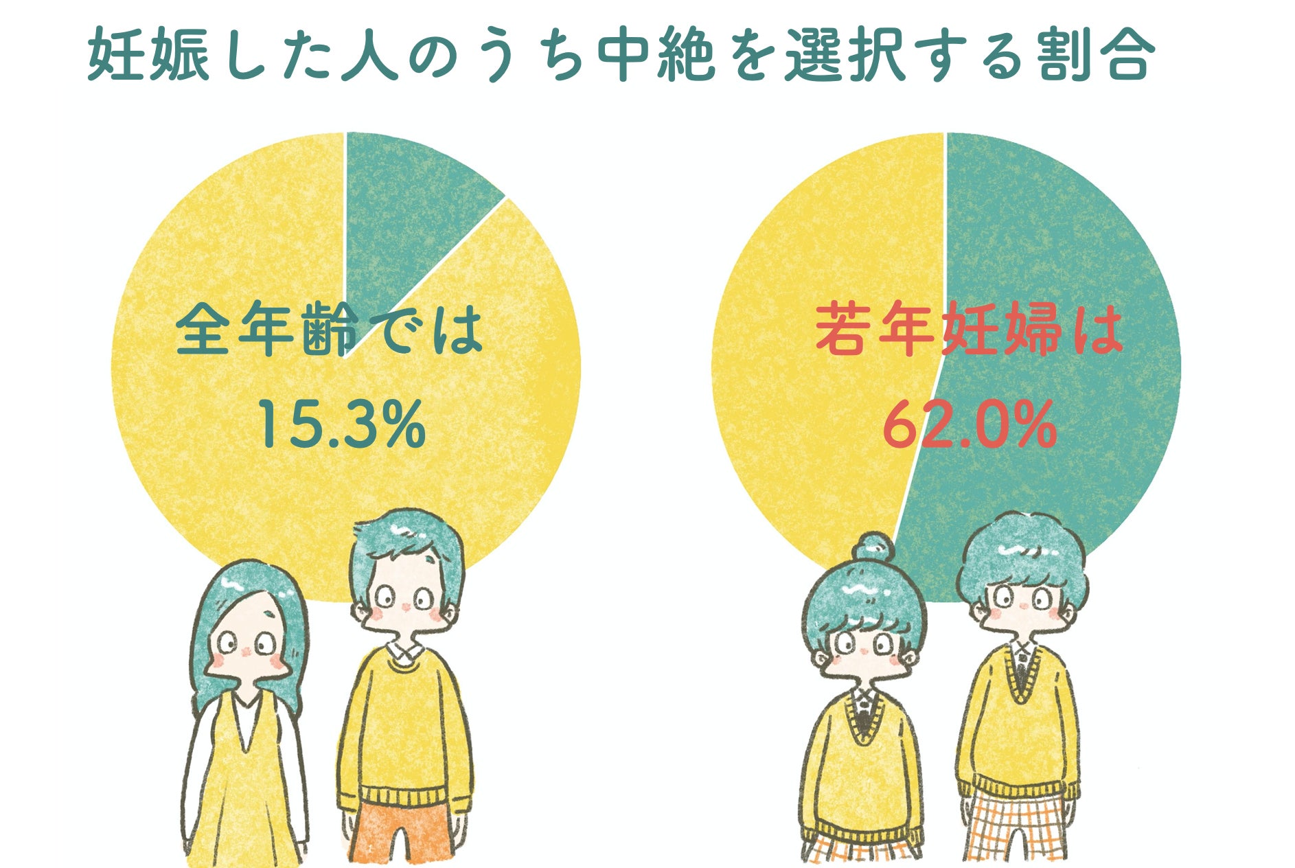予期せぬ妊娠がわかったときには、人工妊娠中絶という選択肢がありますが、中絶は心身ともに負担が大きい手術です。とくに若年妊婦は、妊娠がわかったあとに中絶を選択する割合が上の世代よりも高く、全年齢では15.3%のところ 若年妊婦(未成年)は62.0%と半数を超えます(*1)。