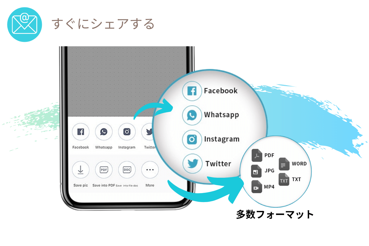 Facebook、WhatsApp、Instagram、Twitter、および電子メールで友人や同僚とメモやアイデアをすばやく共有。