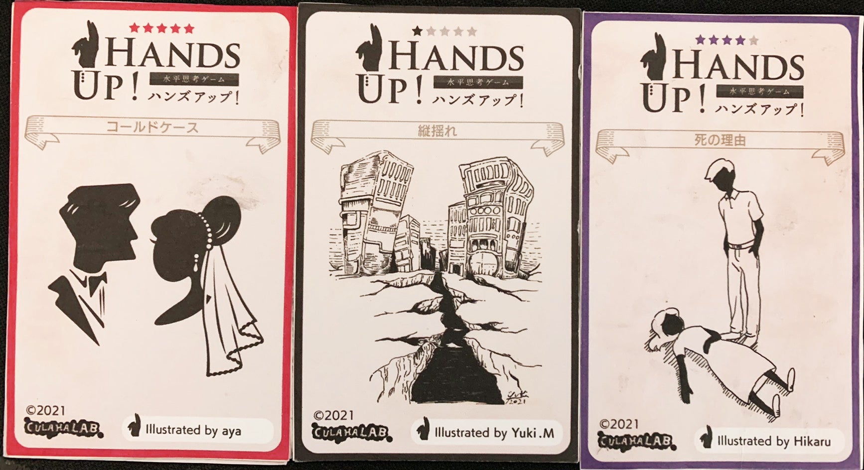 今回は水平思考ゲームというルールを採用し、完全オリジナル問題を「ハンズアップ!」という商品名で作成しました。