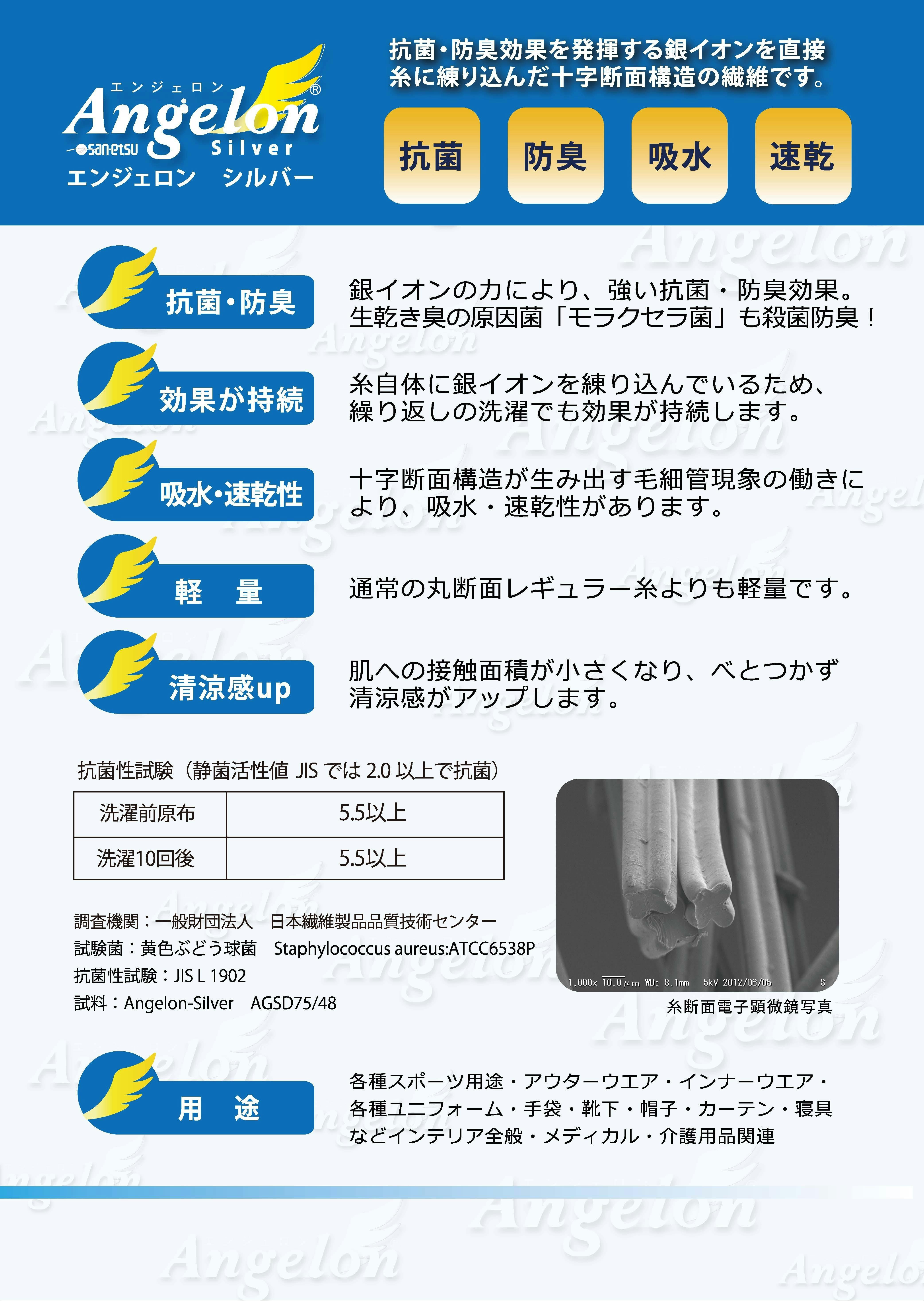エンジェロン・シルバーという抗菌・防臭効果を発揮する銀イオンを直接糸に練り込んだ十字断面構造の繊維を使用しております。