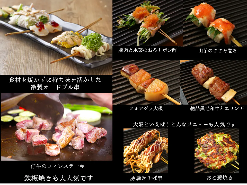 当店の自慢はオリジナリティあふれるメニューの数々です。創作串揚げ、鉄板料理、くわ焼きの名店で修業を積んだ店主が、それぞれの料理の良さをすべて合わせ作り上げた創作串料理の数々は大変好評頂いております。