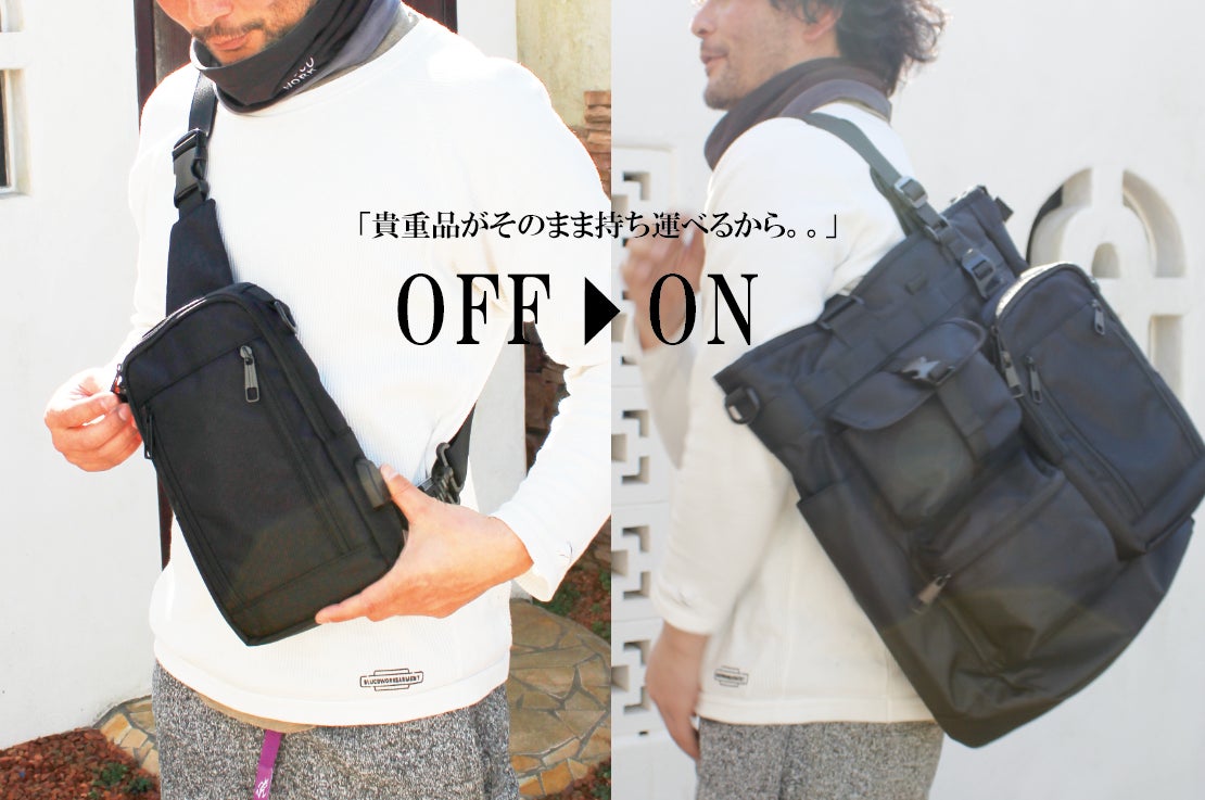 (フロントポケットが簡単に取り外せてボディーバックに変身)
