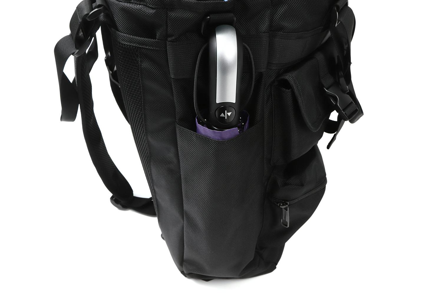両サイドには水筒やペットボトル、折りたたみ傘などを週のできるポケットが装備