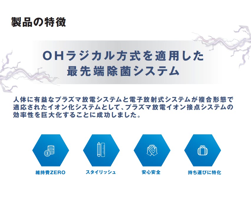 わずか180グラムの軽さで携帯に便利です。オゾンの発生はわずか0.002ppmでまったく人体には無害で、周りをバリアできるほどの十分なOHラジカルを発生させます。