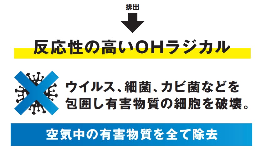 A:OHラジカルと検索するだけで、多くの研究結果が出てくると思います。ウィルスや細菌、バクテリアはもちろん、PM2.5や花粉、黄砂なども酸素と水に分解してしまうので、今のようなコロナ禍、そしてポストコロナ時代においても必須のアイテムになると思います。分子や原子レヴェルの話なのでピント来ないかもしれないので、実験動画がありますので、それをご覧ください。