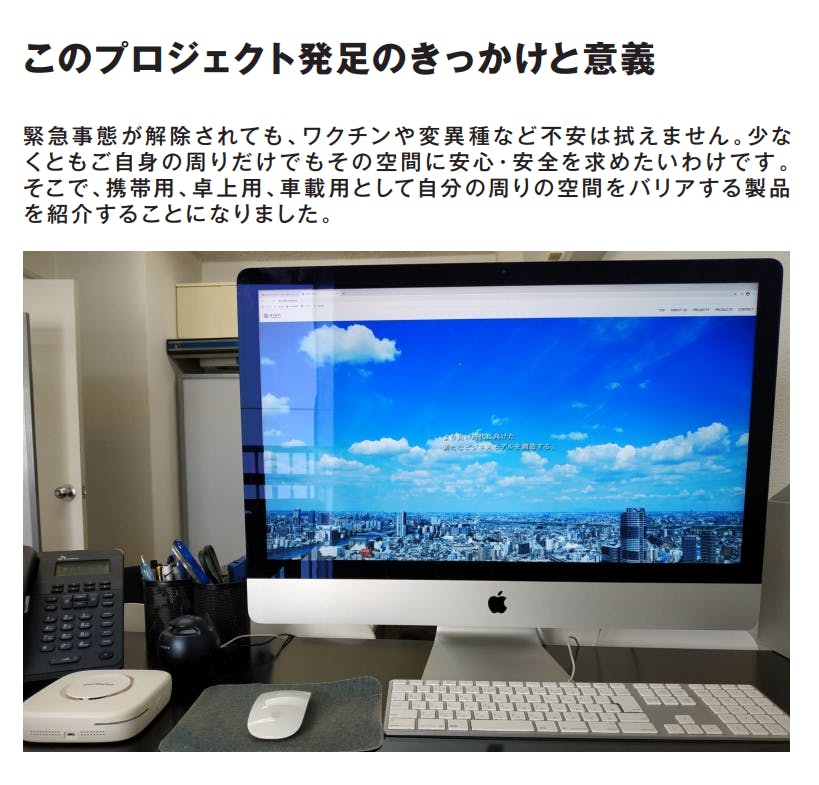緊急事態が解除されても、ワクチンや変異株など不安は拭えません。少なくともご自身の周りだけでもその空間に安心・安全を求めたいわけです。そこで、携帯用、卓上用、車載用として自分の周りの空間をバリアする製品を紹介することになりました。