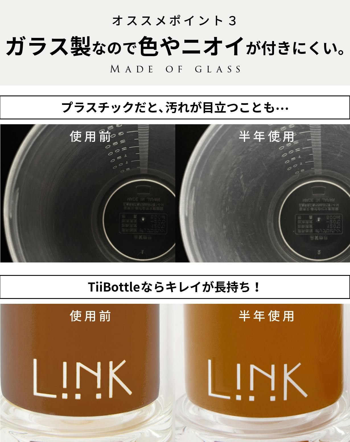 Tii Bottleはガラス製なので、ニオイや色移りの心配もなく、