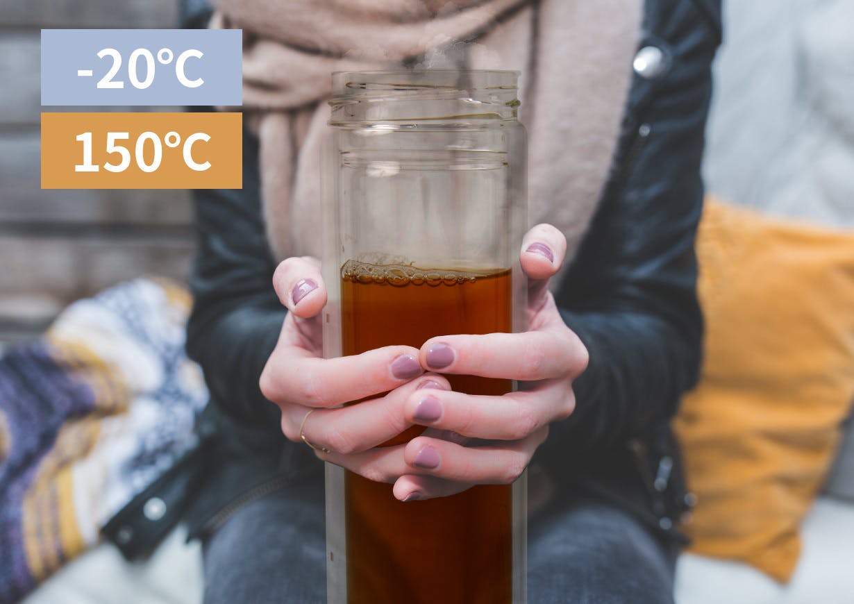 二重構造なので暖かいものを入れて素手で持っても熱くない、冷たい飲み物も結露せずに使えます。