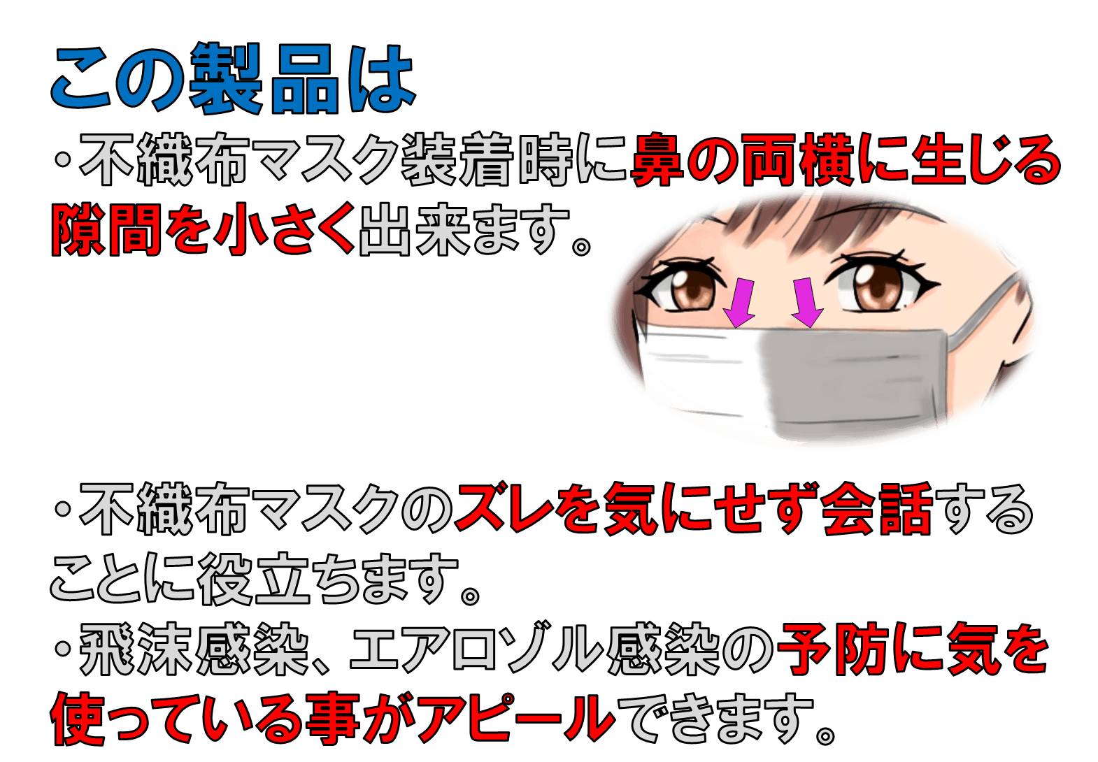 今回開発した製品は、不織布マスクの鼻に当たる部分にある器材(ノーズフィッターとかノーズピース等と呼ばれています)の形状維持を補完する補助器具です(医療機器ではありません)。