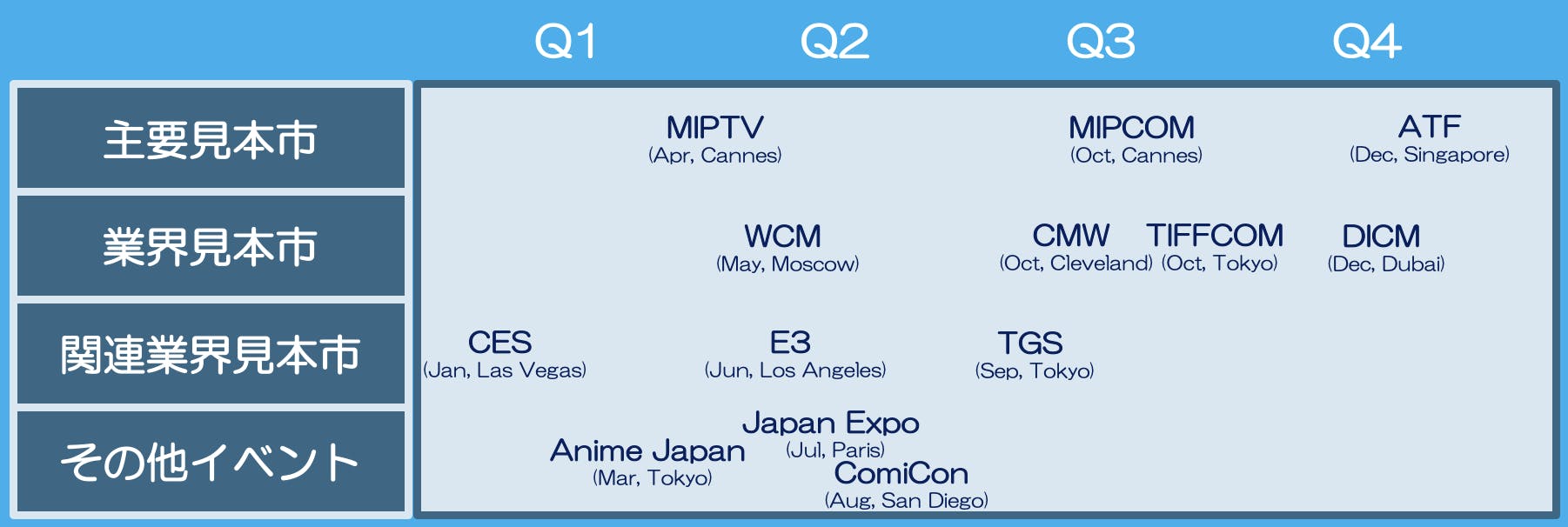 海外からのコンテンツ買い付けを行うための見本市や関連イベントは世界中で年間10回以上開催されています。欧米の主要国から買い付けるだけでなく、世界中から良いコンテンツを集めるため、世界の色々な場所で開催されている見本市にオンライン参加いたします。クラウドファンディングからの一部を出展費用にあてます。
