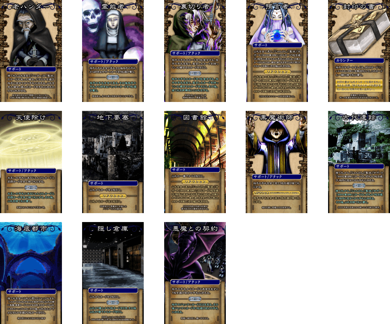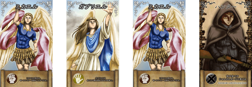 2021/03/08 12:00天界じゃんけんについて、ゲームマーケットのブログへ投稿しました!以下の内容です!↓ルシファーの復活ミカエルとの対決そして、世界の終末 それを阻止するために立ち上がるハンター天界じゃんけんは、2人用のガチンコカードゲーム 2人で共有した山札を使用します。 4種類のじゃんけんカードが入っていますが、ハンターは他の全てのじゃんけんカードに負けてしまいます。 しかし、天使へ対抗できる武器、聖油を使うことでじゃんけんに勝つことができます。ゲームの進行は、交互にターンを行い、後攻のターン終了時に、お互いの手札にじゃんけんカードがあれば、じゃんけんフェイズへ。 じゃんけんに先に3勝したら勝利! 手札から使うサポートカードは、山札、捨て札、相手の手札へ干渉するカードなどで、ハンドの操作を行います。 その中で、自分に有利な状況を作り出して、じゃんけんへ勝つことを目指します。 <ゲームの世界> 「ルシファー」は、地獄へ封印されていた。ルシファーは全ての悪魔の親玉であり、その下部の悪魔たちにより六十六の封印が破られ、地上へ降臨。「ミカエル」は、ルシファーを説得するが、ルシファーは聞き入れず、「ガブリエル」も仲裁に入るが失敗。ルシファーは、完全に力を取り戻していないため、ミカエルから身を隠して力をためている。 一方、ハンターたちは、一般人ではなく、詐欺や泥棒をすることで普段の生計を立てている人たちである。そして、人々を幽霊や悪魔などの怪物から守っているのである。ハンターたちは、六十六の封印を守るために必至に動いたが、悪魔達の数の前になす術はなくルシファーが復活。 ルシファーを再び地獄へ封印するために動き出す。 もっと見る