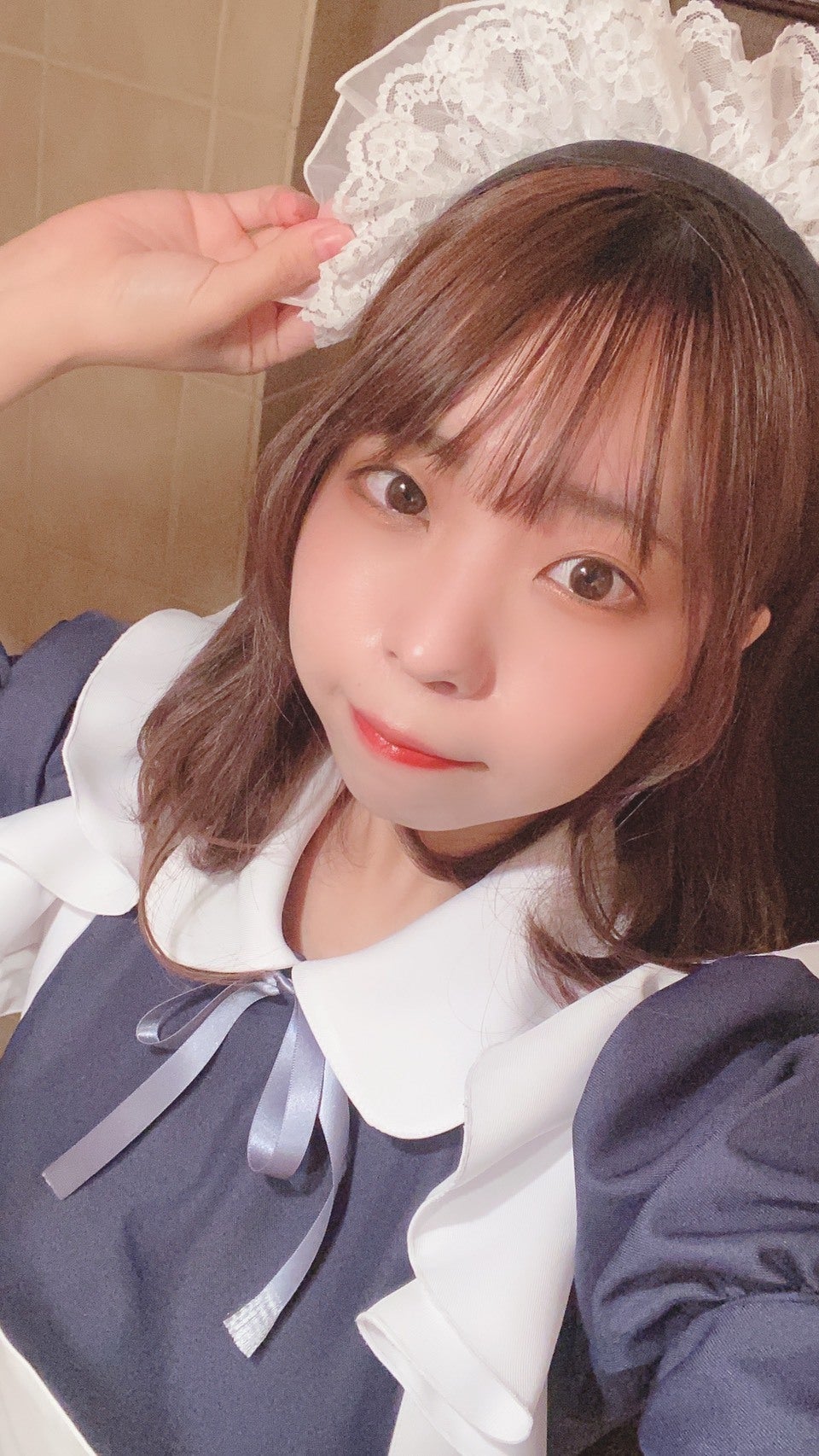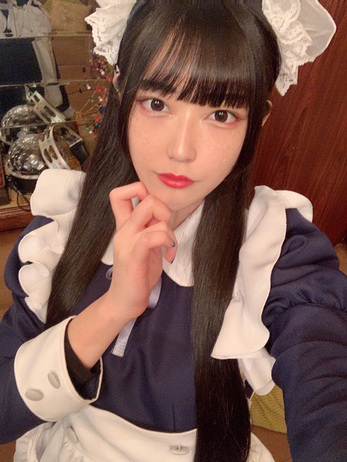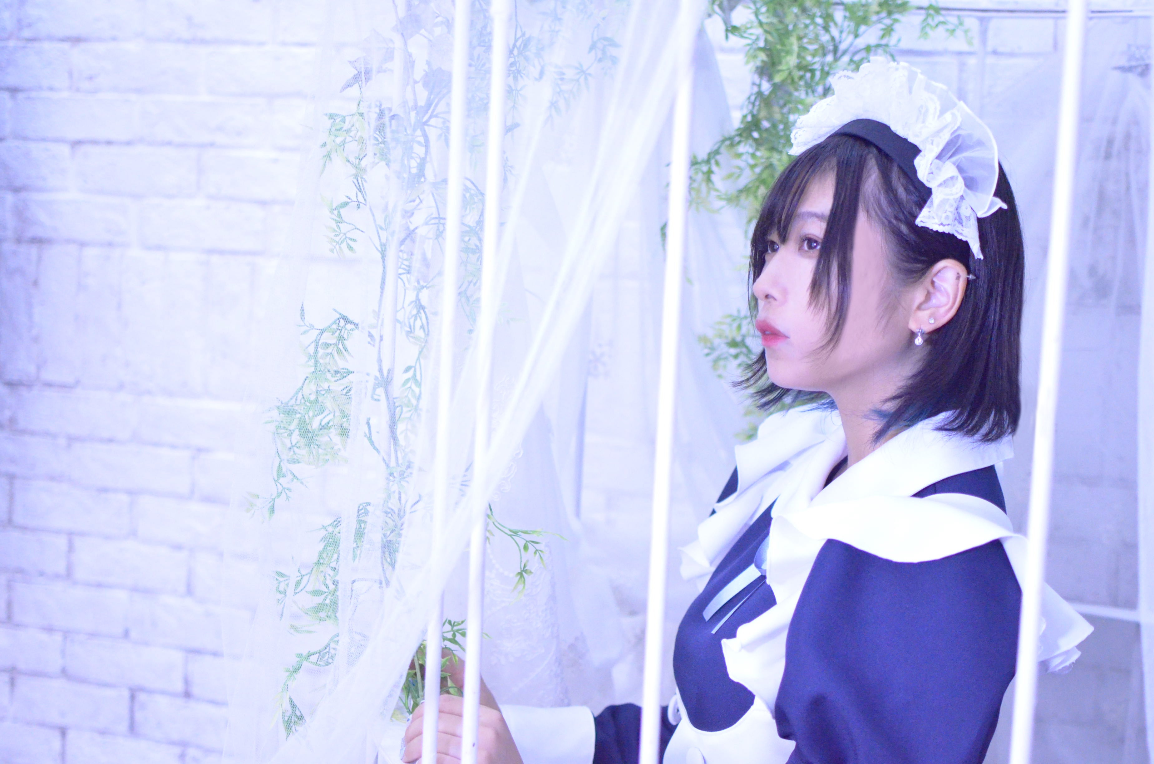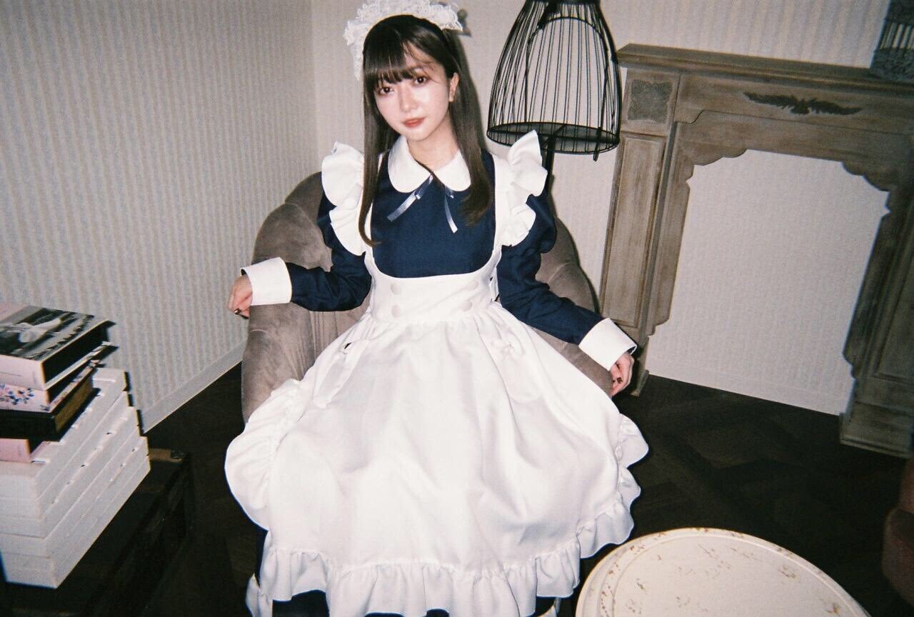 コンセプトカフェの制服はミニスカート丈のところがほぼですが、私個人の理想のメイド服とする、紺と白をベースに、ふんだんにあしらったフリル、上品さの中に可愛さも同居するような、そんな唯一無二の制服を追及した結果、ロングスカート丈のメイド服になりました。
