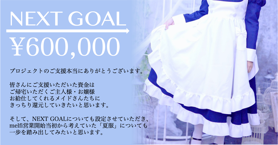そして、既に完売してしまったリターンについても数多くのお問い合わせをいただき、色々考えてみた結果、リターンを追加させていただくとともに、 NEXT GOALを設定し、melfi開業当初から考えていました「落ち着いたら夏服をデザインしたい」という希望の実現に一歩踏み出すことにいたしました。