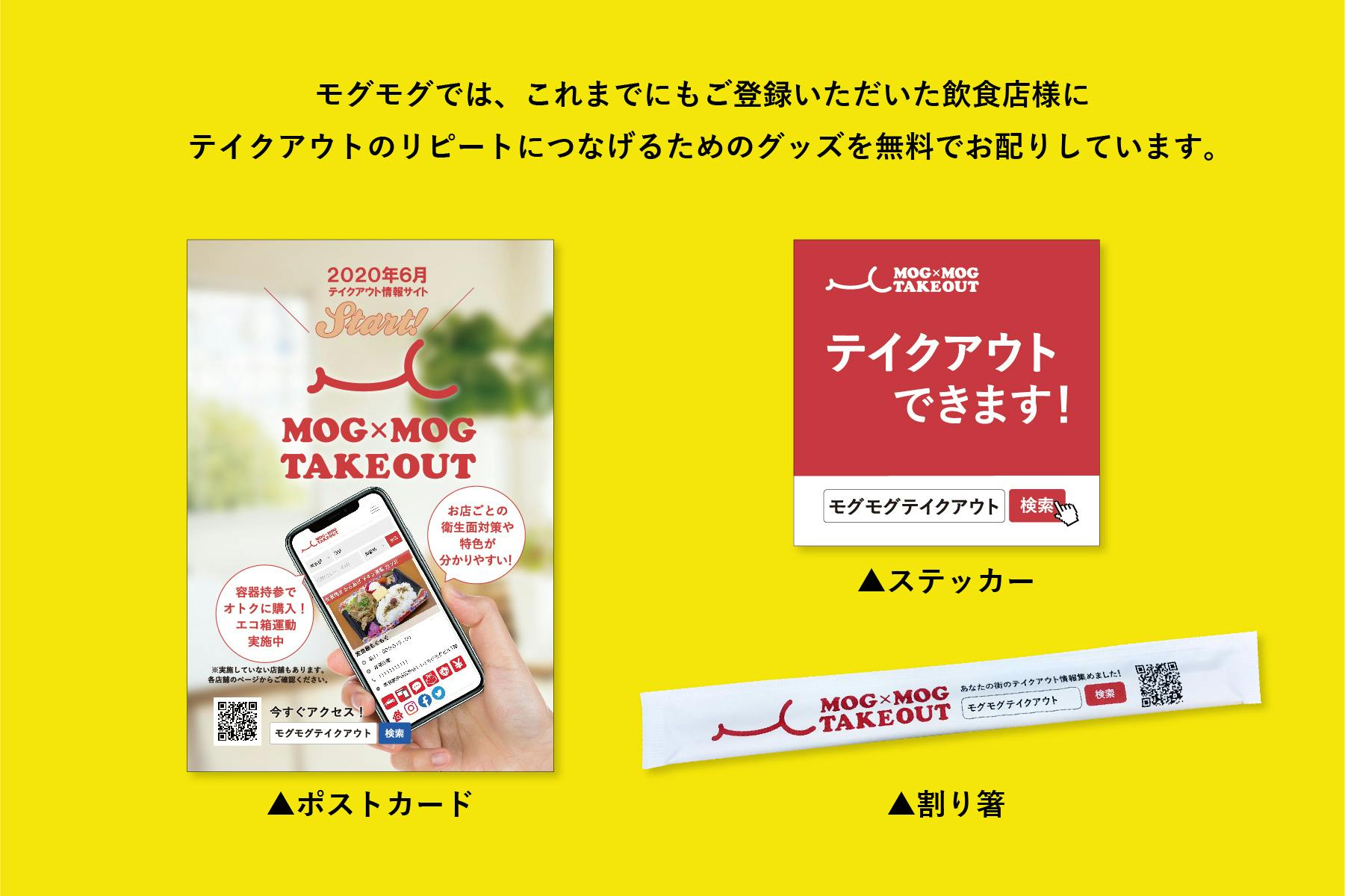 モグモグでは、情報の発信サポートだけでなく、掲載いただいた飲食店には、テイクアウトの購入・リピートにつなげて頂くために、利用客に向けてテイクアウトのPRができるグッズ(モグモグのオリジナル割り箸やステッカーなど)を無償配布する取り組みも行っています。
