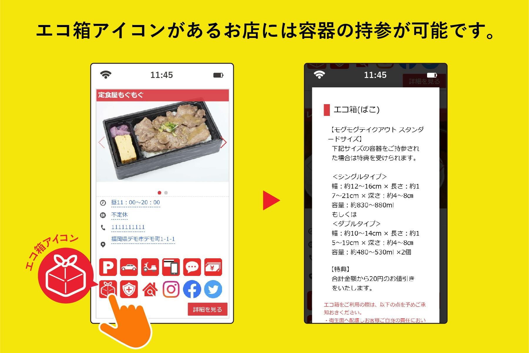モグモグに掲載している店舗で、エコ箱アイコンがある店舗に容器を持参すると、お店ごとの特典(おかずの追加や値引きなど)を受けることができます。