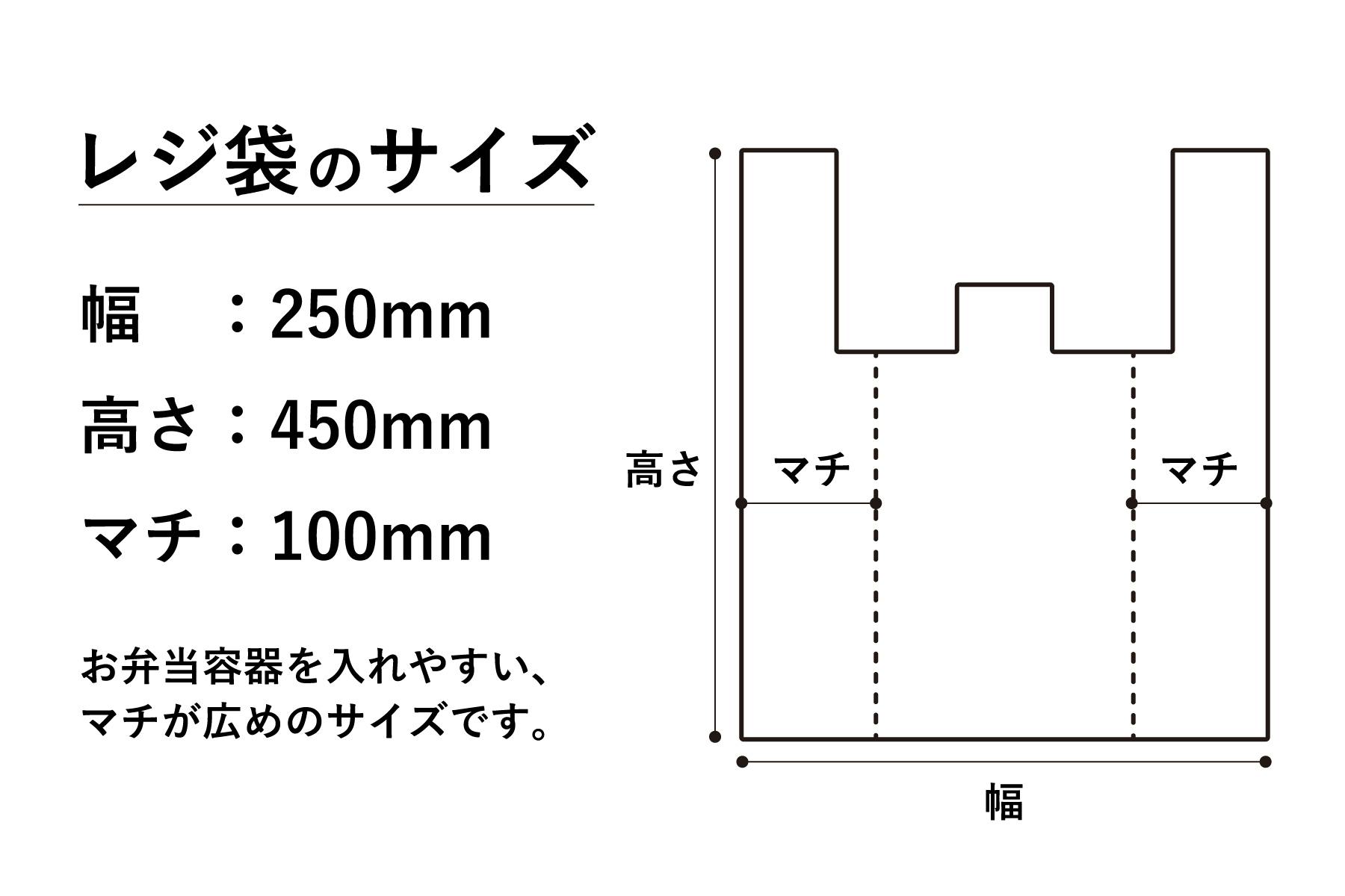 レジ袋のサイズですが、これまでに当社でテイクアウトした際に利用されていたレジ袋や業者の方からサンプルとして提供いただいたレジ袋を参考に、テイクアウトとして汎用性が高く、利用しやすい、持ちやすい、マチの広いサイズを予定しています。