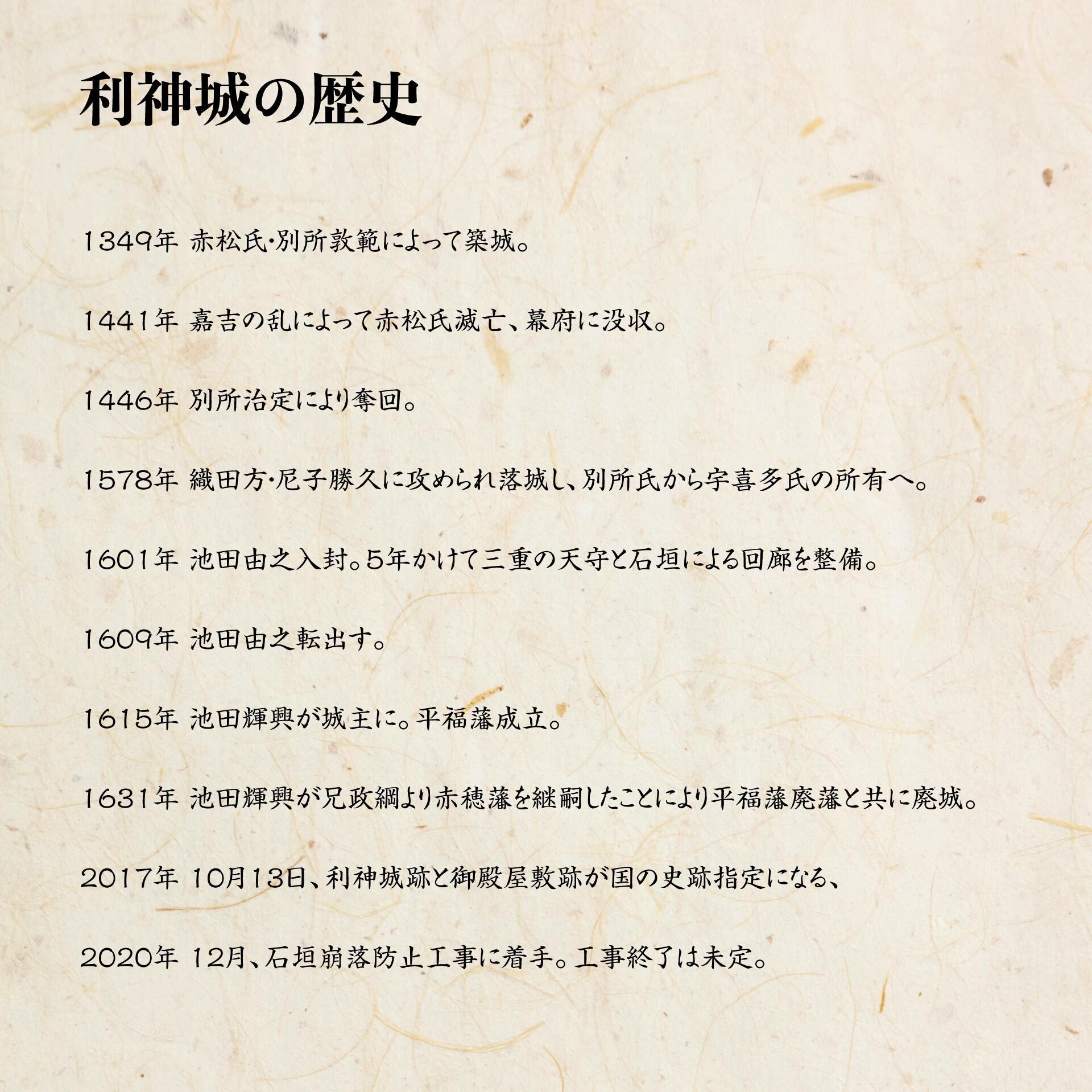 そんな平福地域にある利神城跡は、およそ700年近い歴史を持つ古城で、室町時代には別所氏、戦国時代には宇喜多氏らが山城を築城しました。