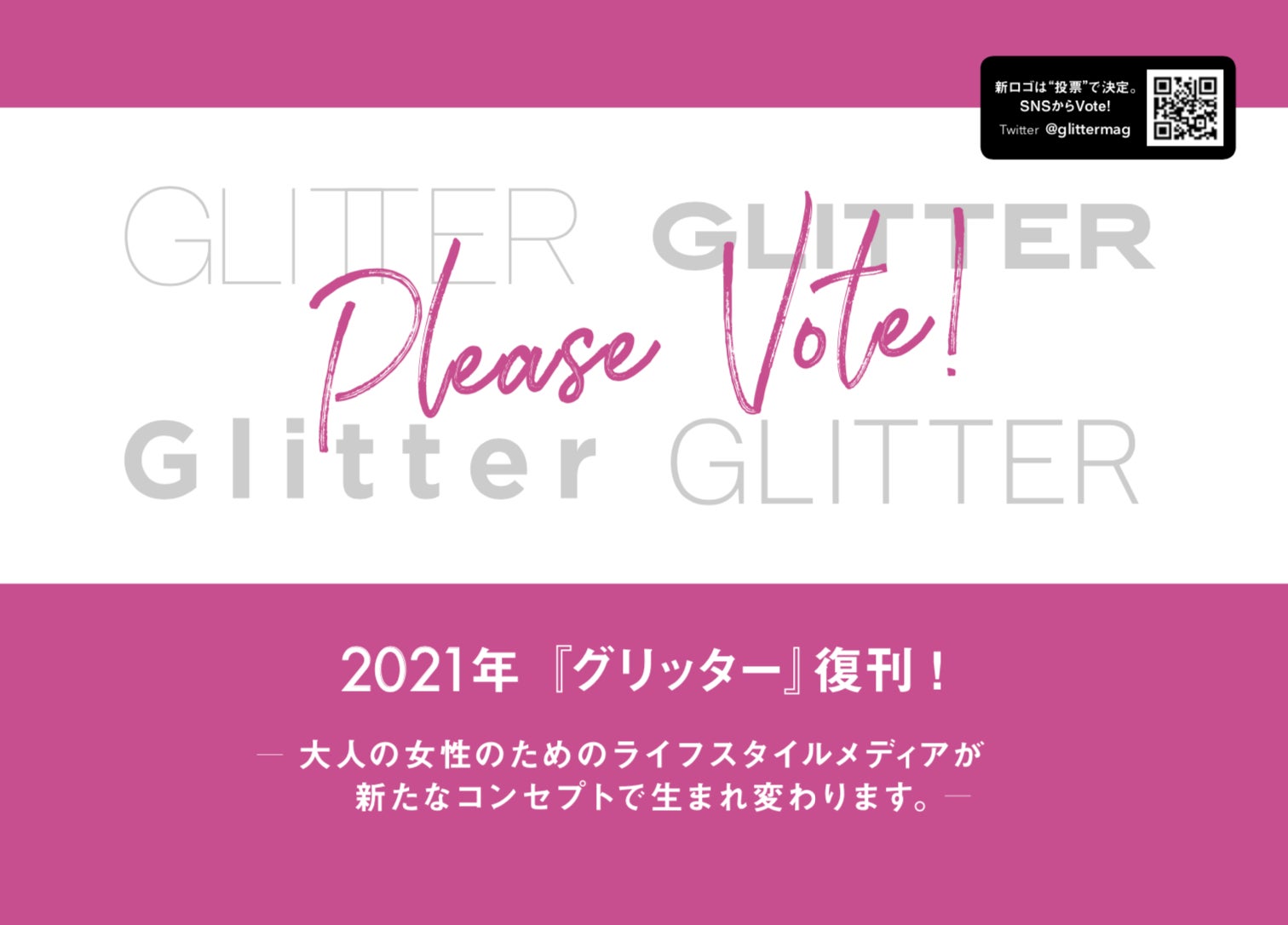 「雑誌という紙のメディアにしかできないことは何か・・・それは“表現の場”であるということ。雑誌からはアーティスト・クリエーター・モデルなど数多くのスターやトレンドが生まれてきました。混沌とした今の時代にきらめきを生み出し、そして、世に中に新たな刺激を届けるプラットフォームとして『新GLITTER』を一緒に創っていきませんか? ワクワクすることを発信したい、誰かと共有したい、面白いことを形にしたい!そんな思いがある方の参加をお待ちしています!」