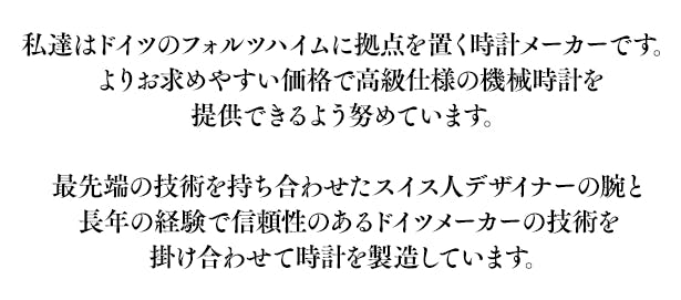 「同社も中国のムーヴメントメーカーから機械の供給を受けていますが、他社と異なるのが、ドイツ時計産業の中心地であるフォルツハイムを拠点として、企画立案、組み立て、クオリティーコントロールを行っているという点。
