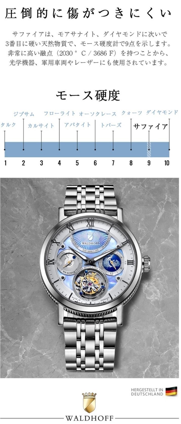 また重厚感ある「ステンレススチールバンド」はフォーマル、カジュアルどちらでもWALDHOFFの高級感と存在感をアピール。