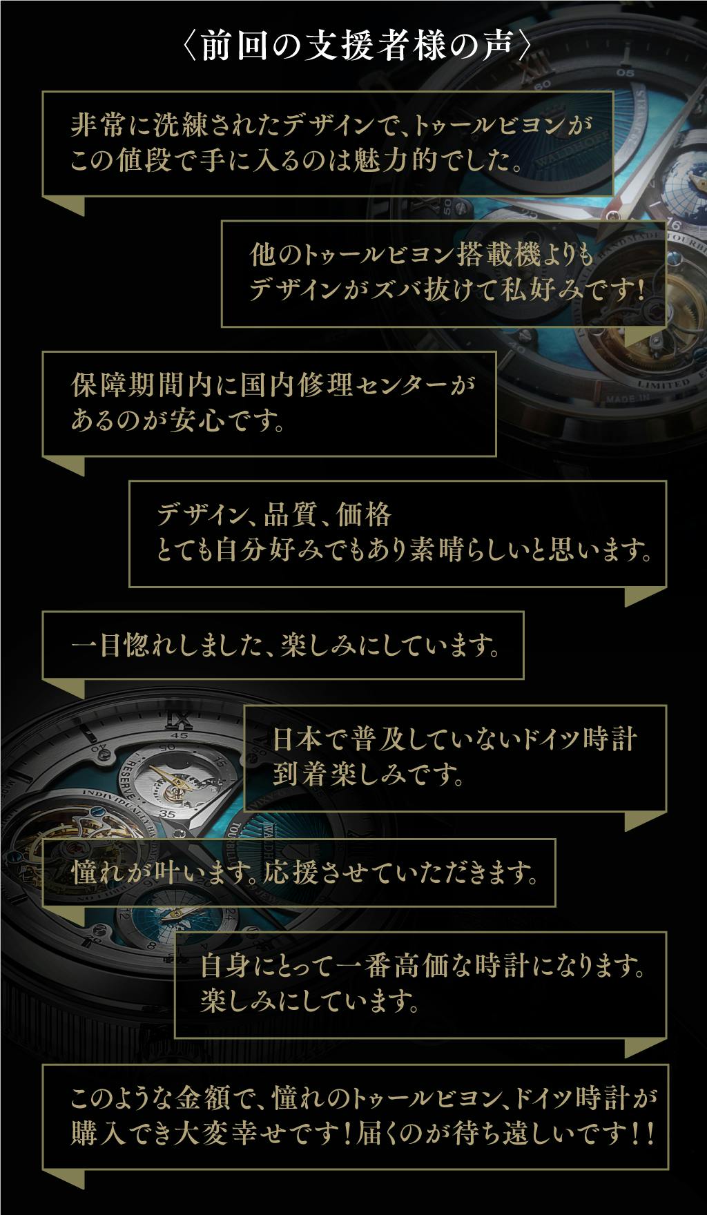 前回初めてmachi-ya にてドイツWALDHOFF社製トゥールビヨン腕時計をご紹介したところ、支援者の皆様から多大なご支援を頂きましたこと、ここで改めて感謝申し上げます。