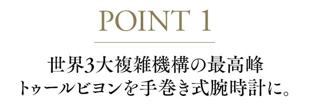 また、近年濫造されているスケルトン仕様のトゥールビヨンではなく、あえてトラディショナルなシンメトリデザインを採用しているのも特徴です。