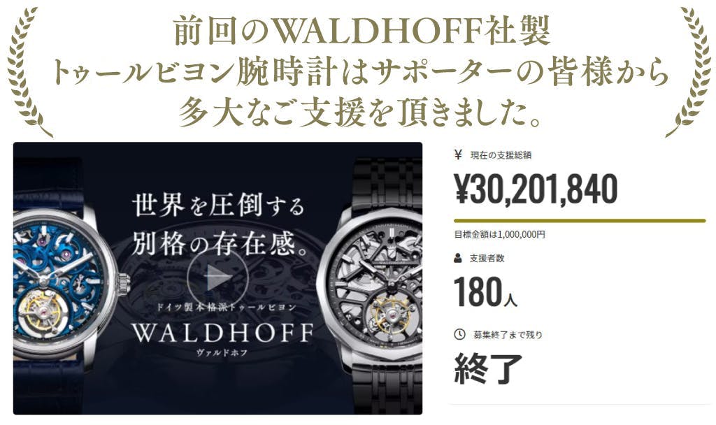 今回もmachi-ya支援者の皆さまには、ドイツ腕時計ブランド「WALDHOFF(ヴァルドホフ)」の魅力が伝わり、ひとりでも多くの方々にご支援いただければ幸いです。