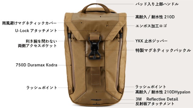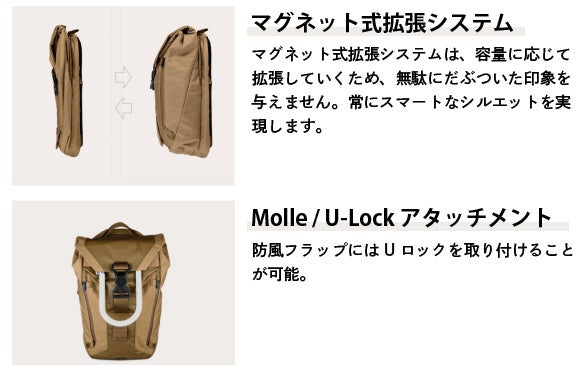 拡張機能にも工夫があります。マグネット式の拡張機能によりスタイリッシュな見た目を保ち続けることが可能です。試行錯誤を重ね完成したこのデザインは、通常の拡張型バックと異なり段階的に必要な分だけ拡張していくため、無駄にだぶついた印象を与えることもありません。